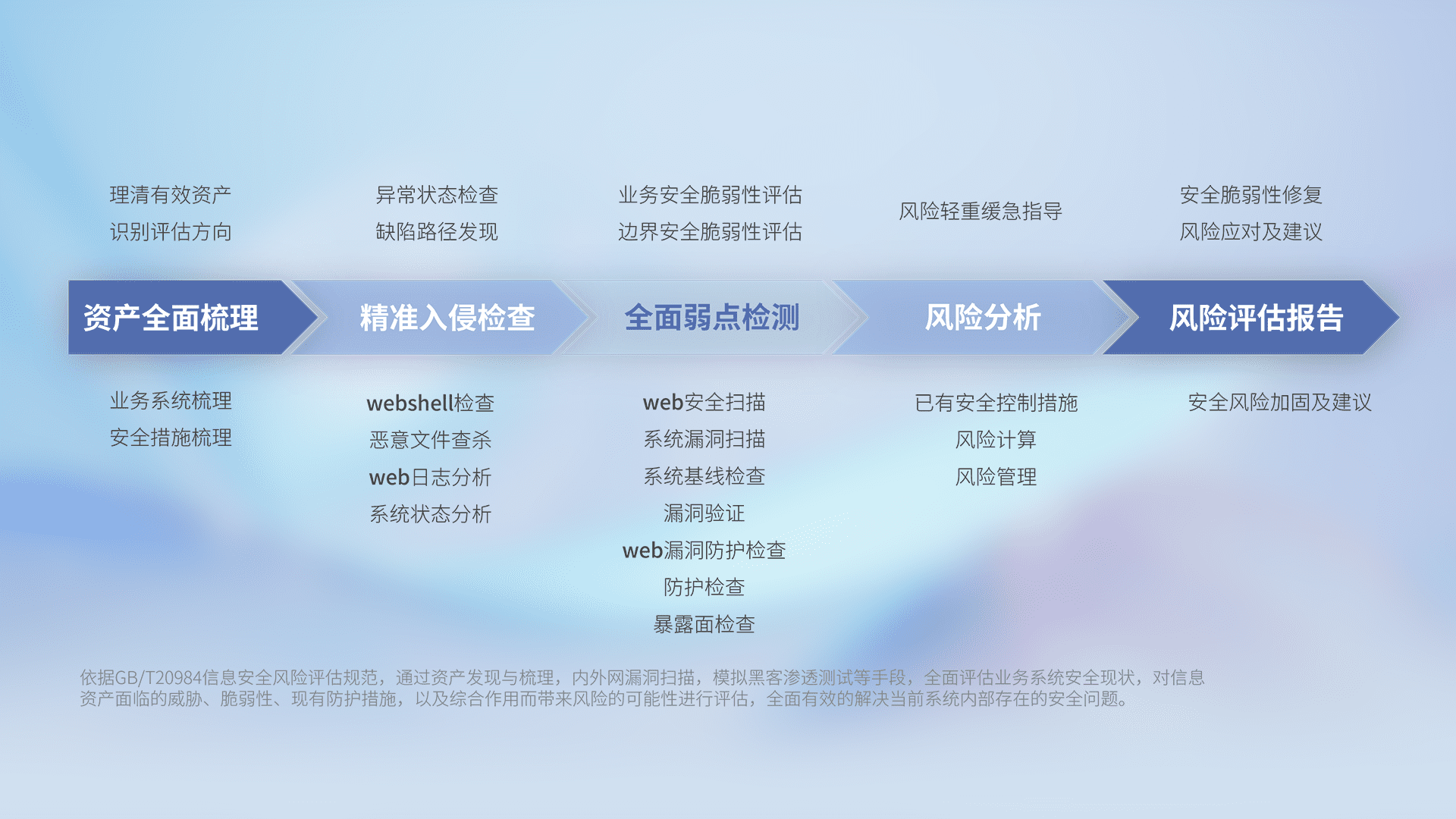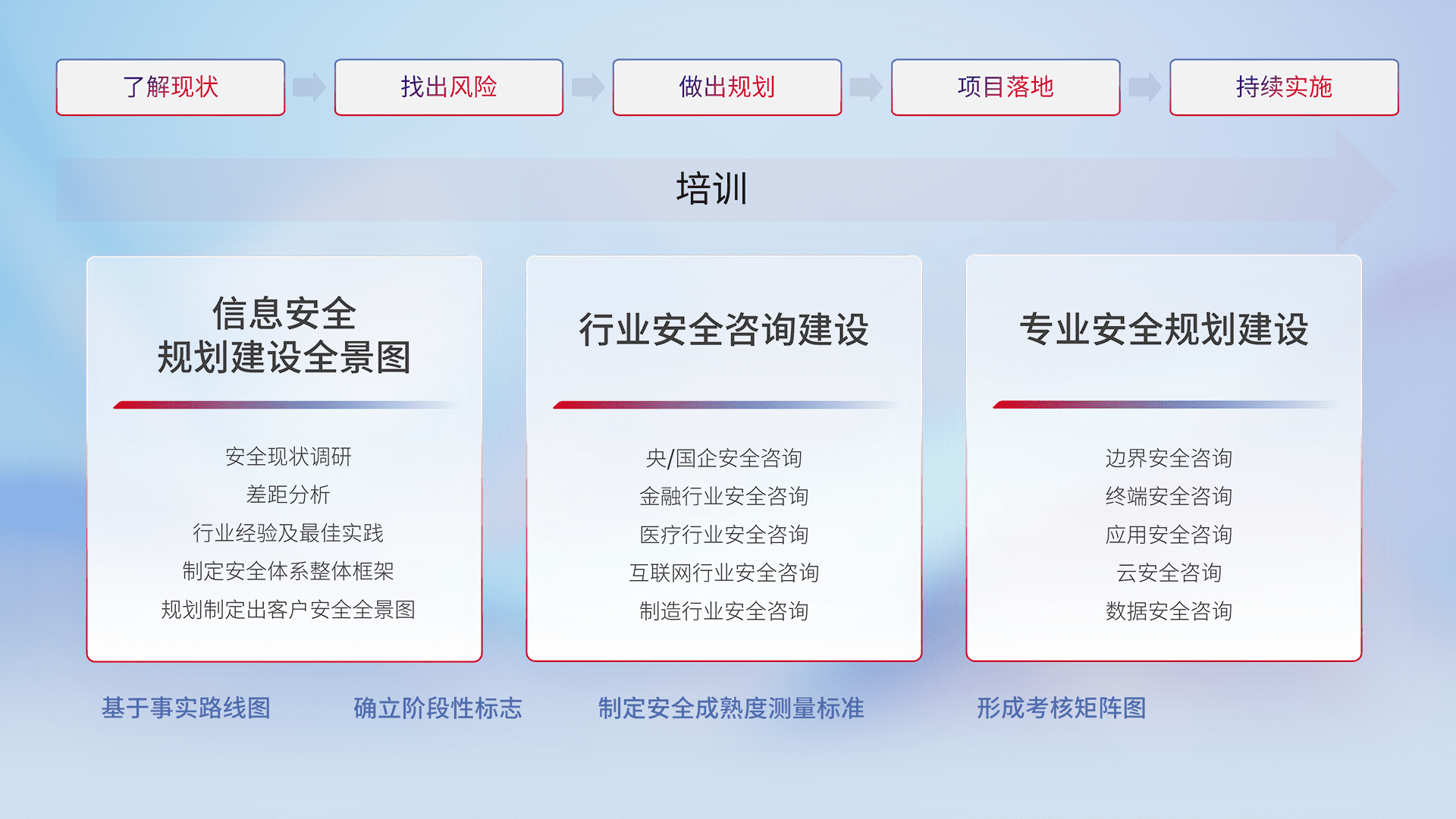 针对客户行业特性,,,以专业的安全服务+多厂商联合解决方案提供专属的一站式安全管理服务,,,帮助客户全面感知网络空间威胁,,,基于识别、、、检测、、分析、、防护、、、、监测、、、、响应的服务理论模型,,从方案咨询、、集成交付、、、评估验证、、、优化加固、、、运维运营,,,致力于为客户提供完整的闭环管理式安全服务。。。。以实战经验为客户打造高抵御风险的安全体系,,,,帮助客户发现威胁、、、、对抗威胁、、处置威胁,,,不断积累安全对抗能力,,持续保障数字化安全。。。。